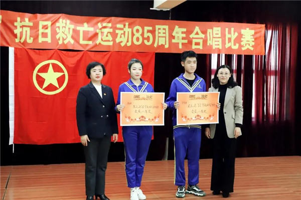 图片图:马雪菲校长为最佳领唱1904班杨博驿、最佳指挥1906班王博禹颁奖