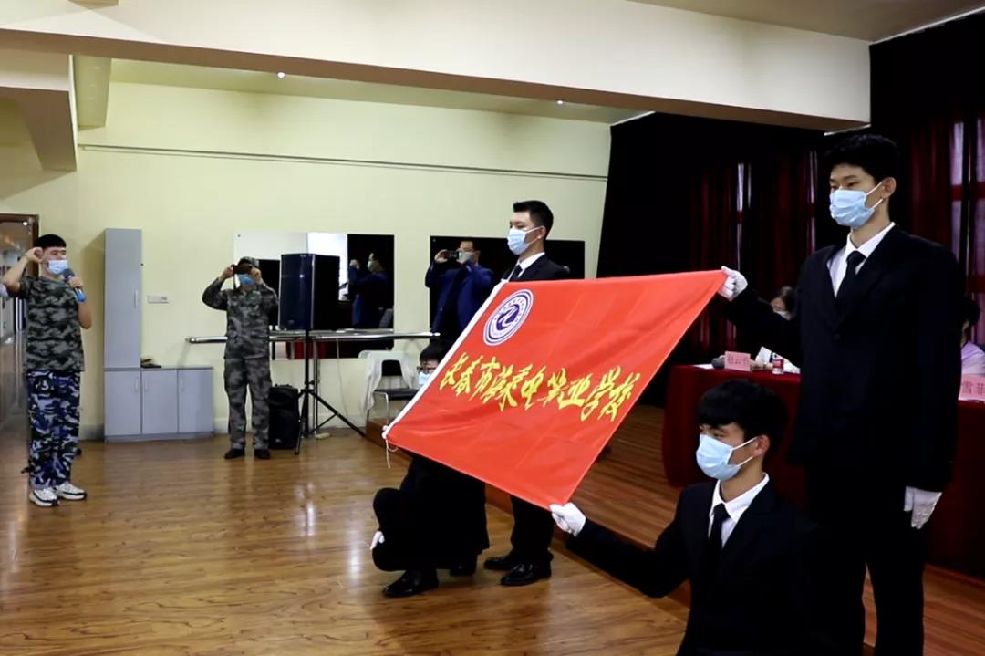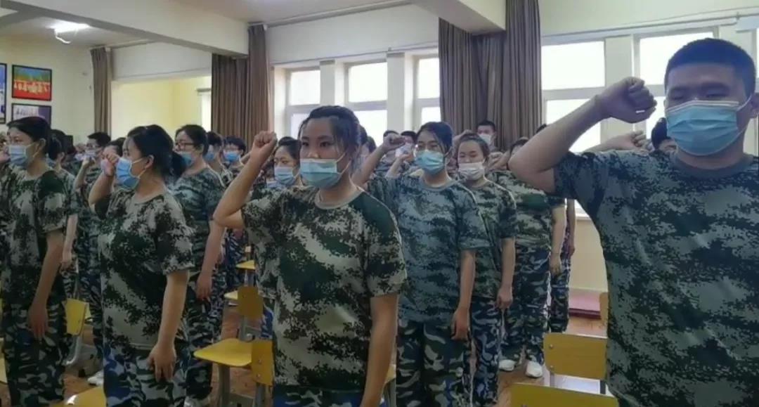大会最后一项集体宣誓,与会同学整齐列队,举起右手,在学生代表王玉云成领誓下,面向校旗庄严宣誓:服从命令、听从指挥 、刻苦训练 、不怕困难、尊重教官、团结同学、磨练意志、为校争光!